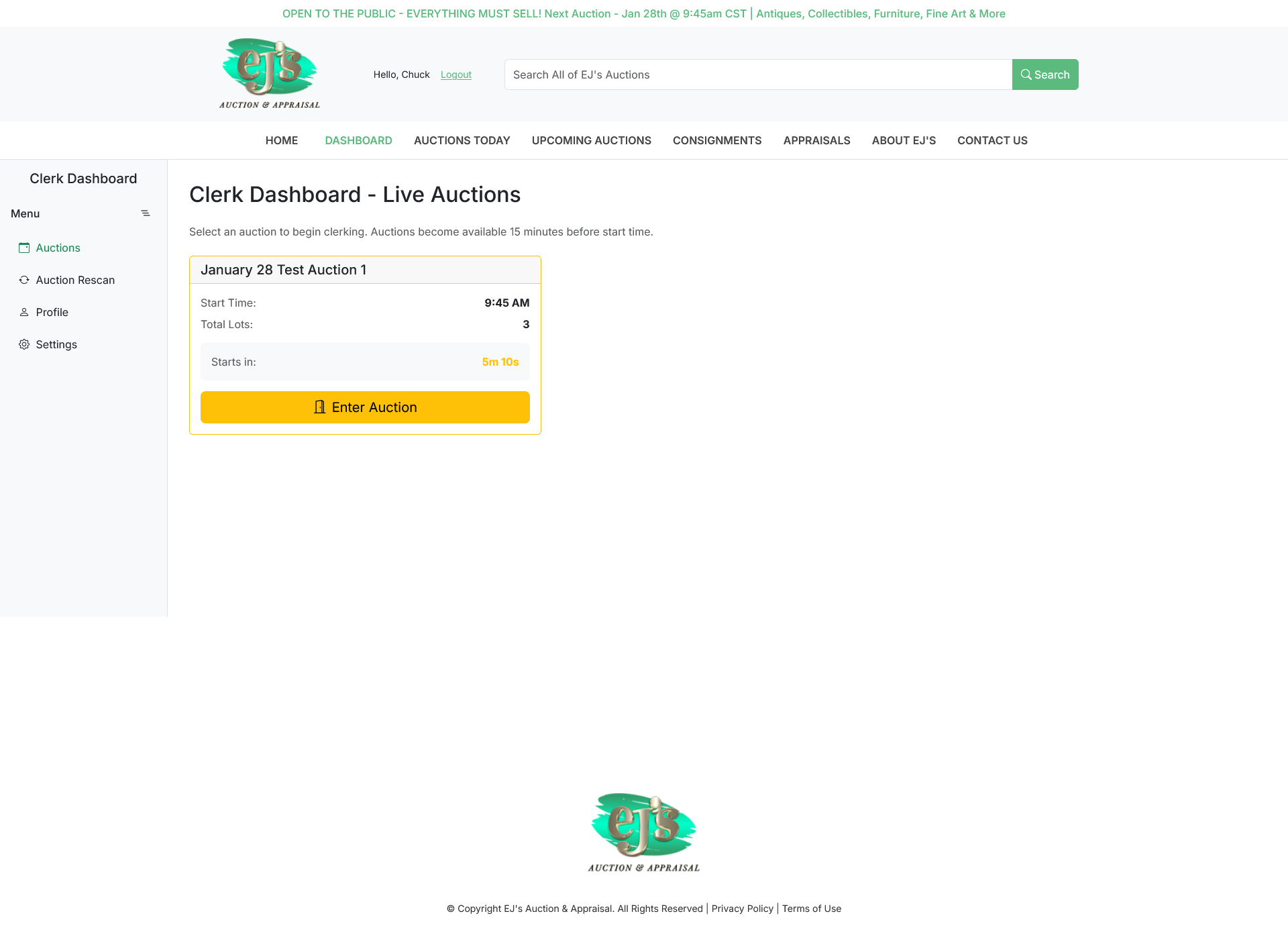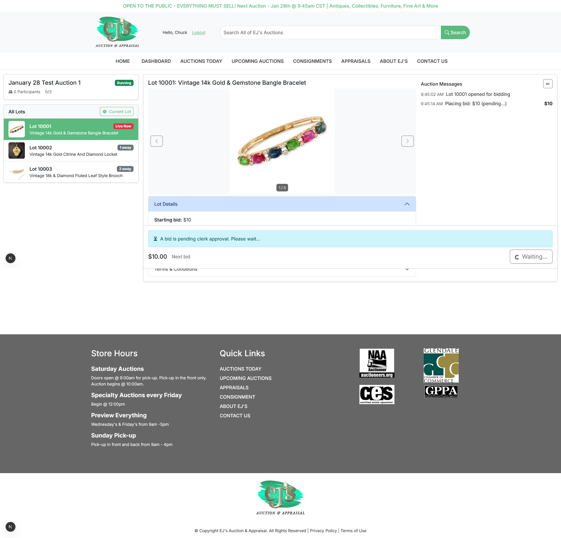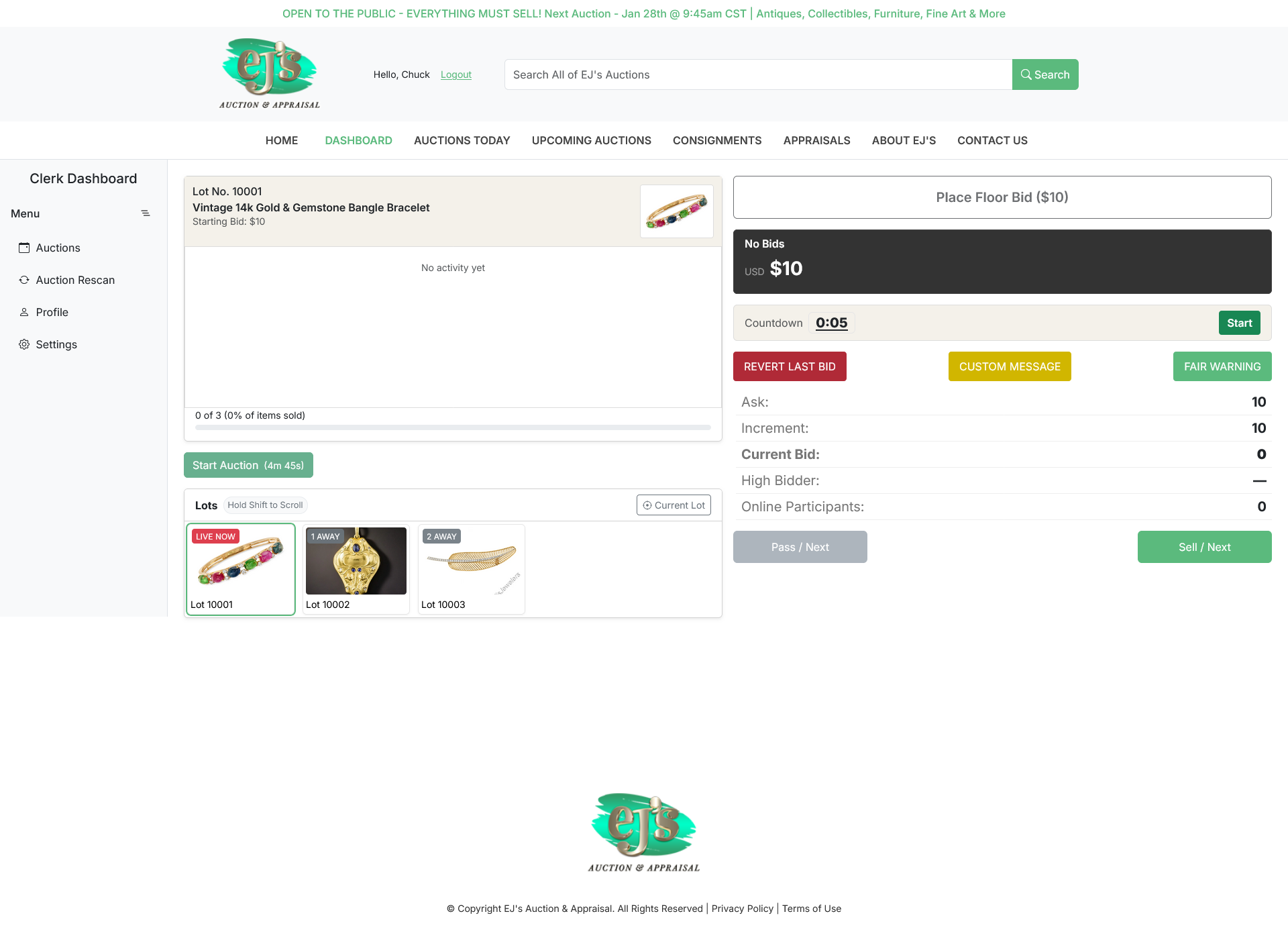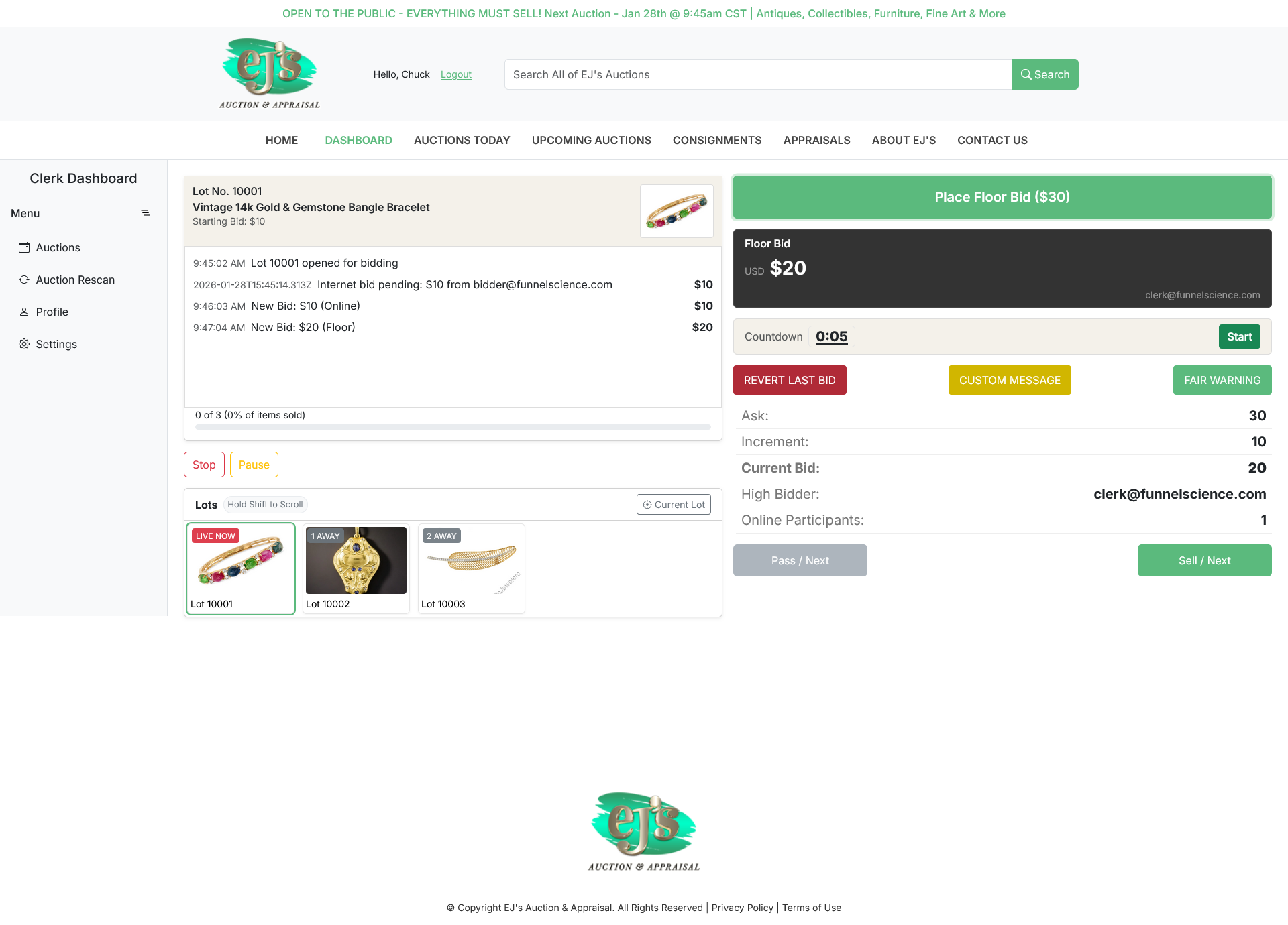 Bidders can place bids before or during the live event. Clerks manage live auctions, accepting both online and in‑house floor bids. The system includes an auction timer to support clerk workflow, and clerks can issue “Fair Warning” and other notifications to online bidders.