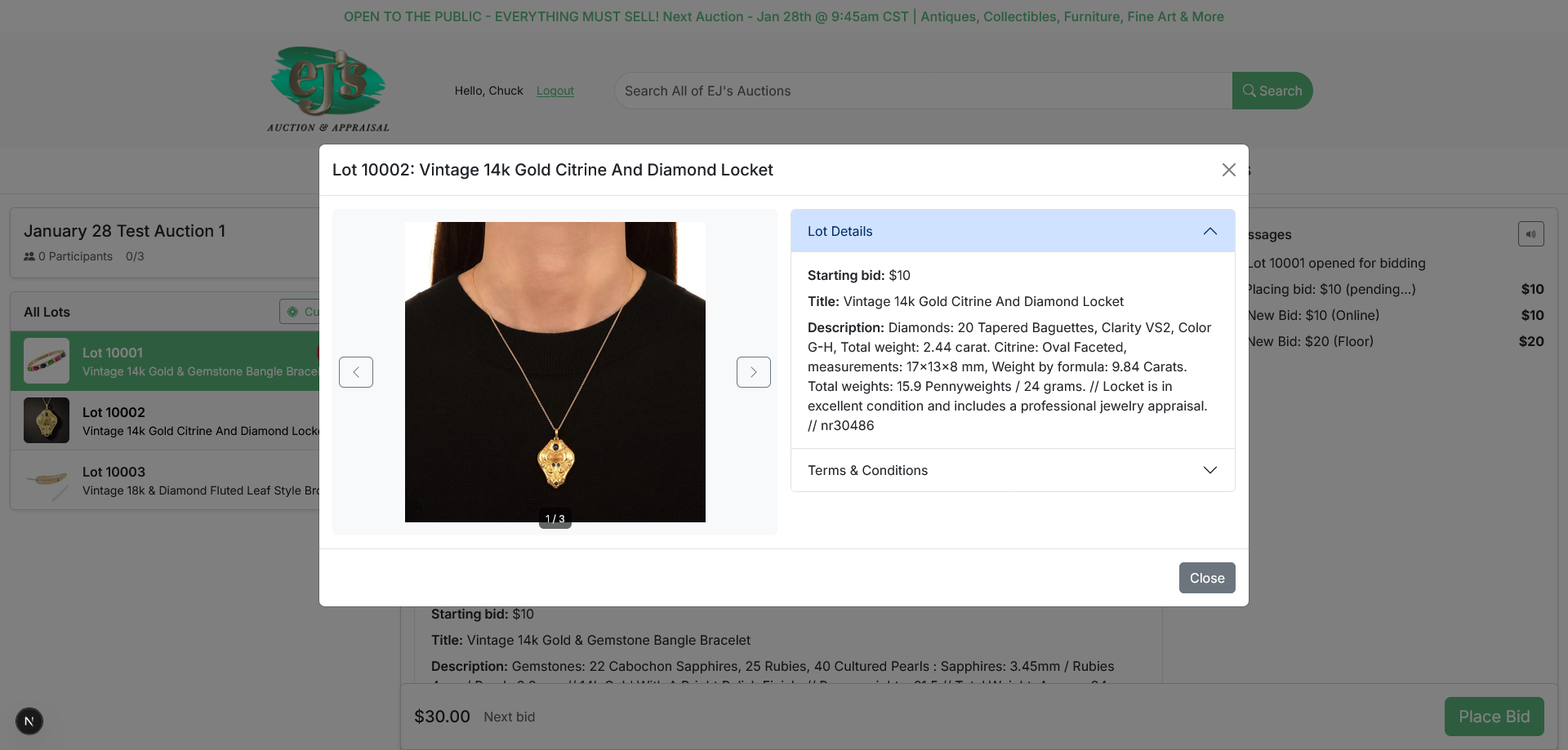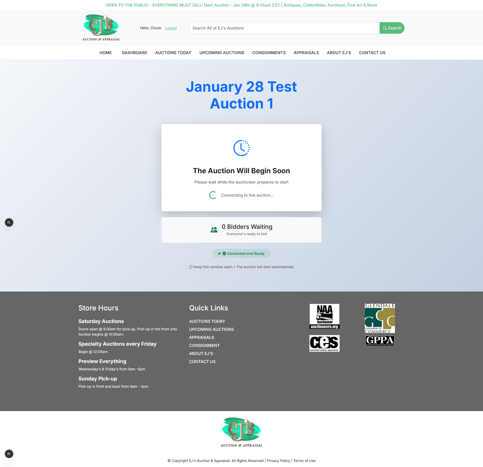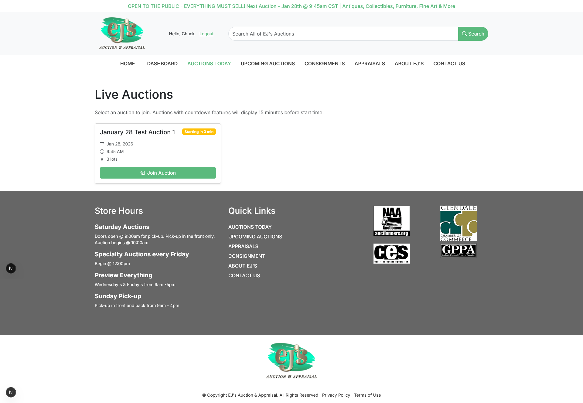 Bidders can place bids before or during the live event. Clerks manage live auctions, accepting both online and in‑house floor bids. The system includes an auction timer to support clerk workflow, and clerks can issue “Fair Warning” and other notifications to online bidders.