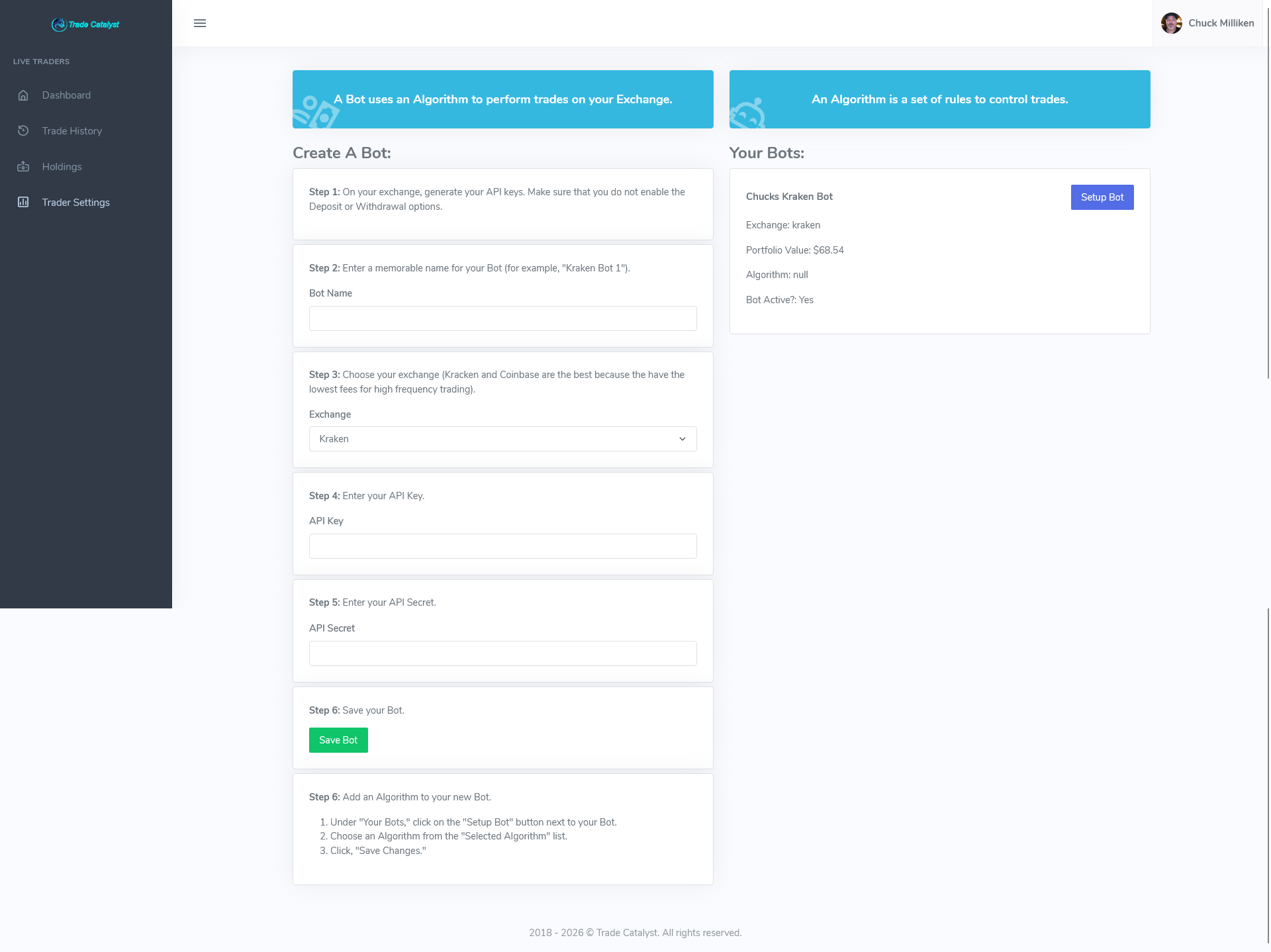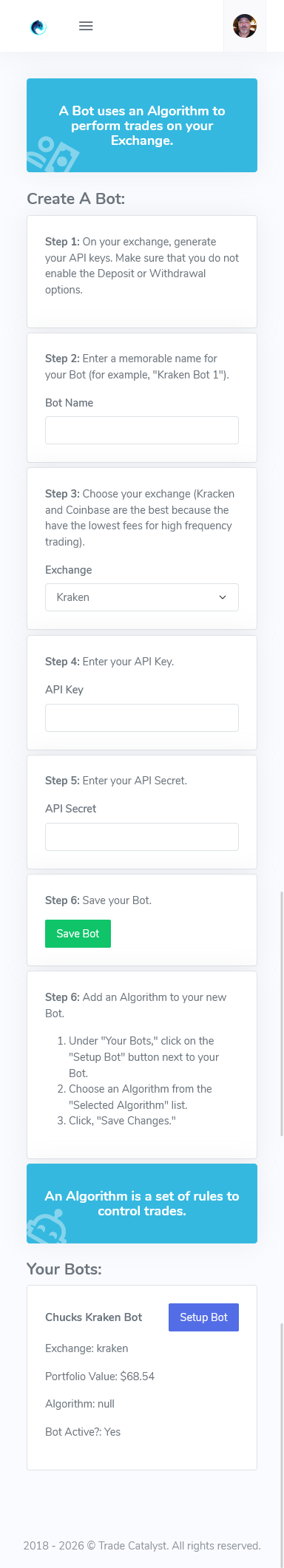 The backend uses optimized algorithms, AI, and custom rules to automate trades based on market performance. The top‑performing bots are made available to app users. Access to app functions provided by LAMP-based API